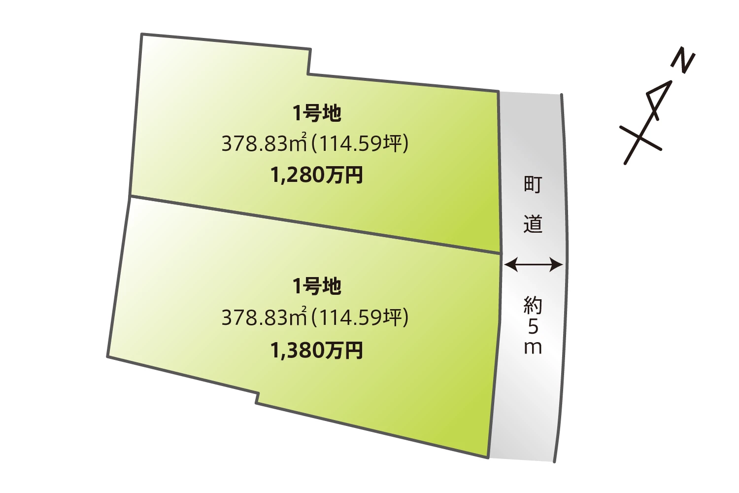 土地面積 | ●1号地:378.83㎡(114.59坪) ●2号地:441.40㎡(133.52坪) | 道路 | 道路幅員/北東:約5m |