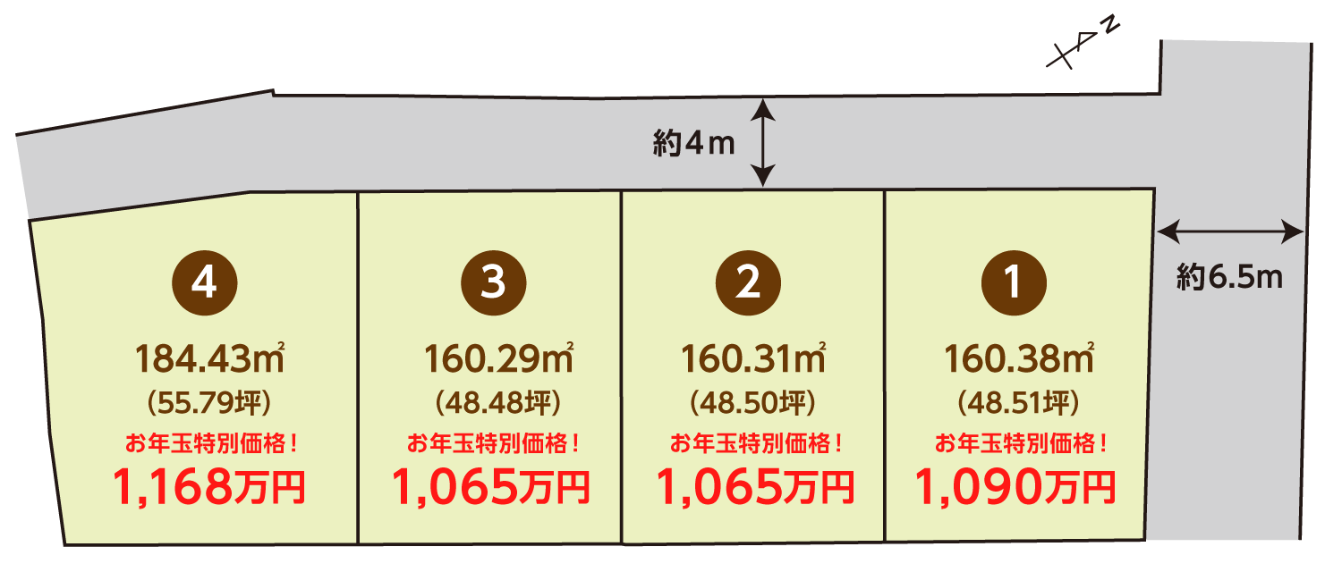 | 土地面積 | 160.29㎡(48.48坪)〜184.43㎡(55.79坪) | 道路 | 道路幅員/北東:約6.5m、北西:約4m |