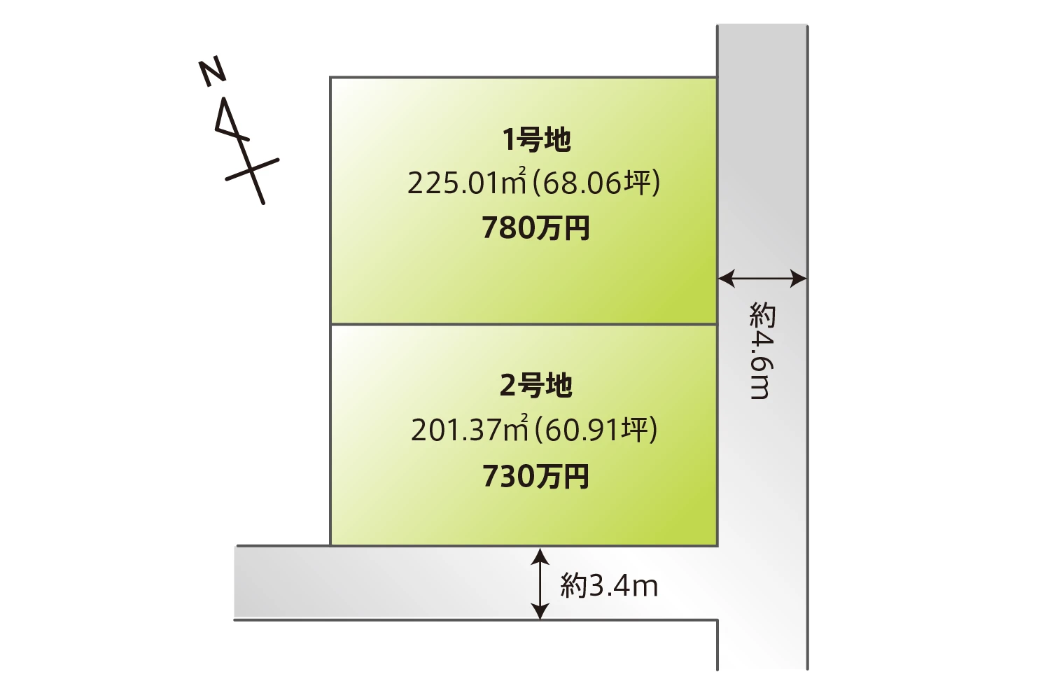 | 土地面積 | ●1号地:225.01㎡(68.06坪)/●2号地:201.37㎡(60.91坪) | 道路 | 道路幅員/1号地:約4.6m(東)・2号地:約4.6m(東)、約3.4m(南) |