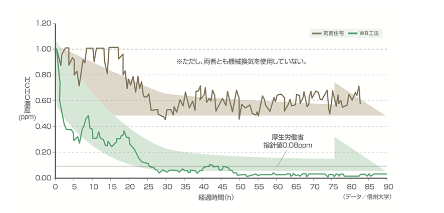 ・WB工法の通気構造によって、VOC・ホルムアルデヒドの濃度滞留を短縮できる